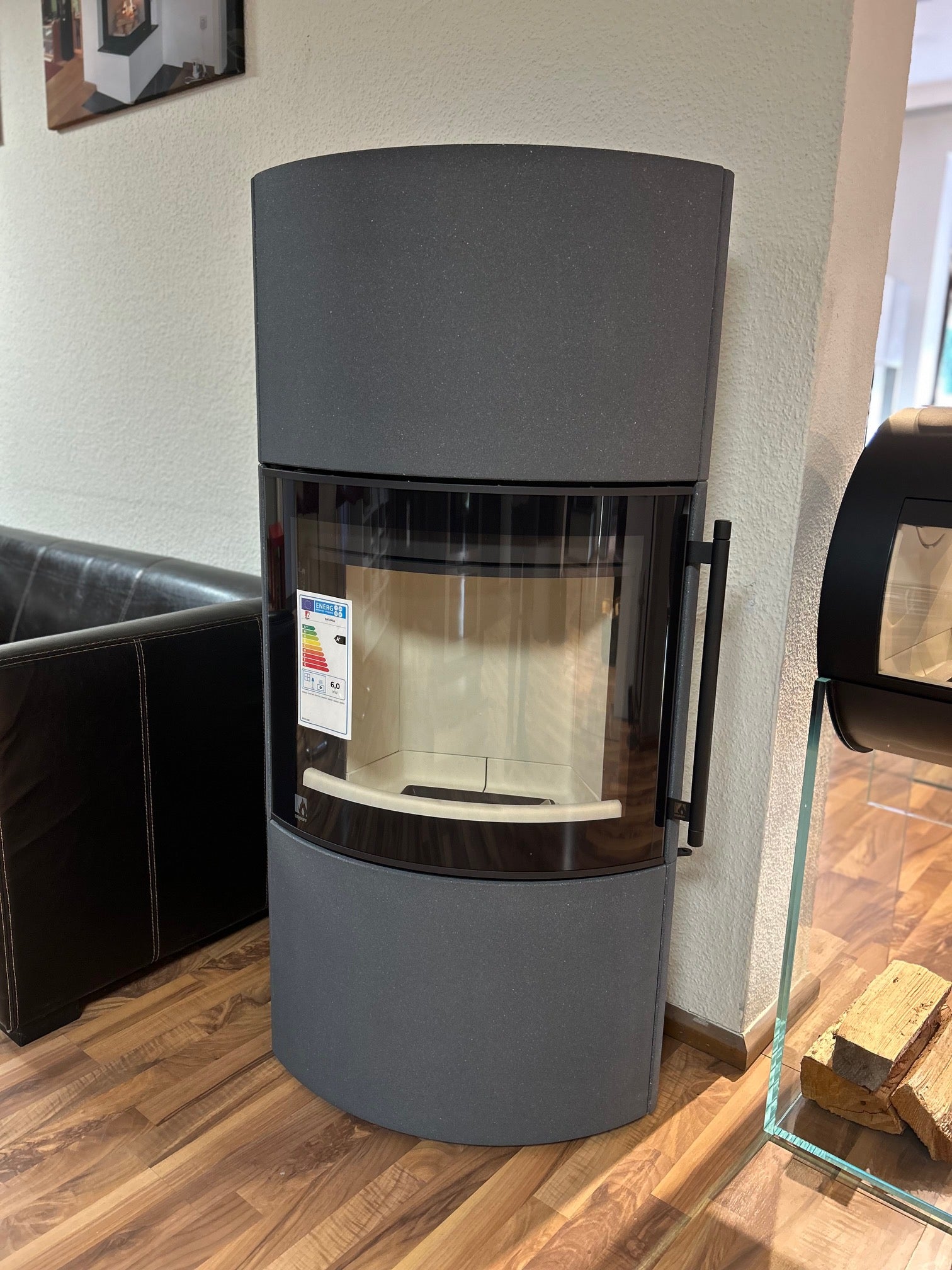 Kaminofen in Betondesign. Rahmenlos bedruckte Scheibe von aus Schott Robax Glaskeramik sowie elegant eingefasste Topplatte mit verdecktem Konvektionsspalt.